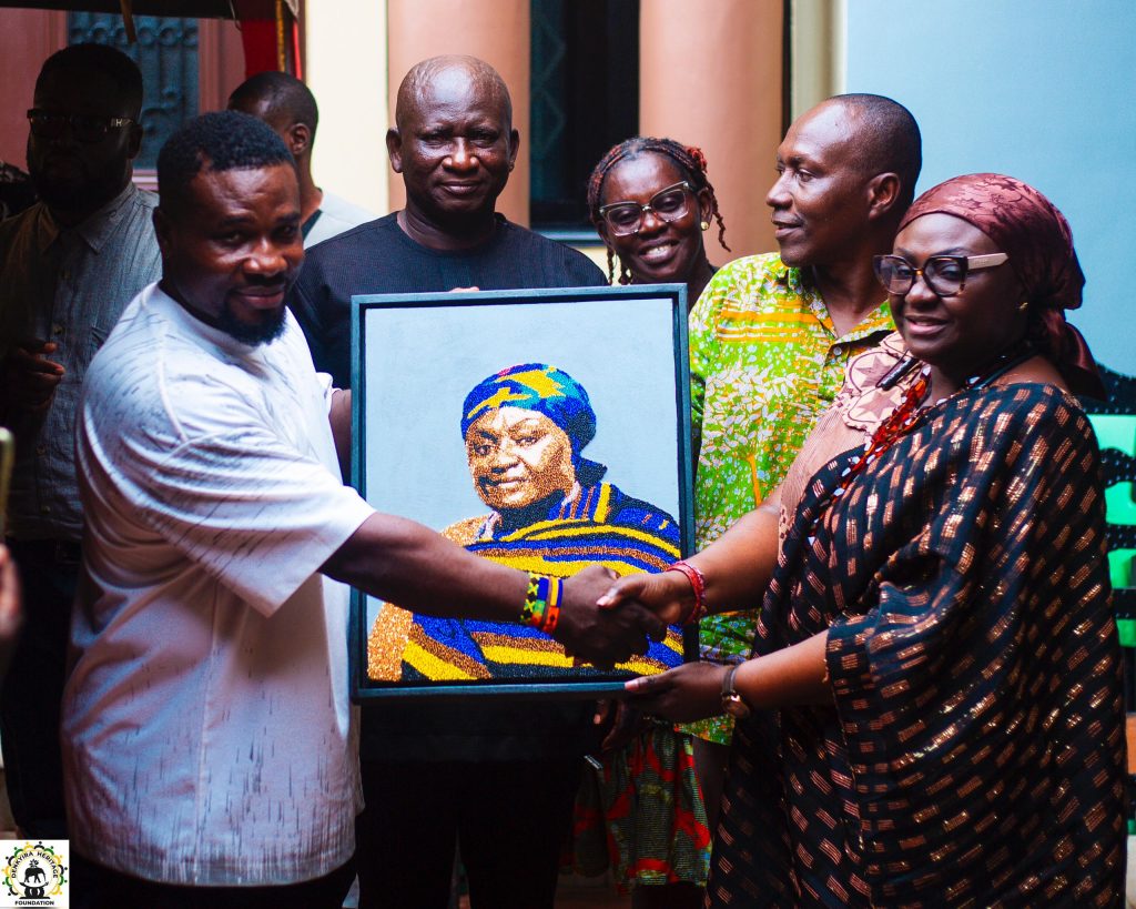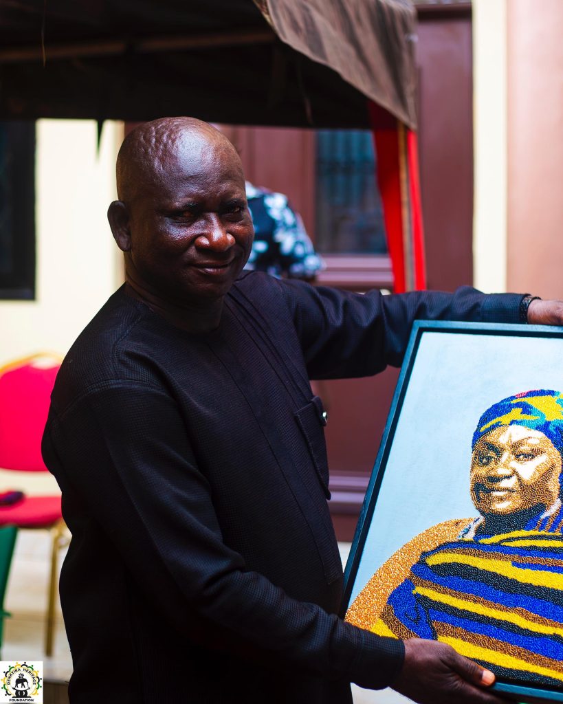 - A beaded portrait of the Denkyirahemaa, reflecting the sacred golden beads of the Bankam Dwa (the Black Stool of Denkyira). The diverse shapes and colours of the beads represent the varied opinions, beliefs, and strengths of Denkyiraman, which when united, form a kingdom of unmatched beauty and resilience.